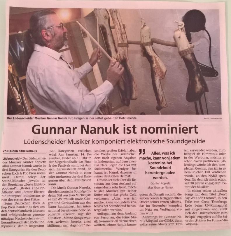 Lüdenscheid - Der Musiker Günter Kopietz alias Gunnar Nanuk, der in seinen Werken auf effektvolle Weise elektronische Klänge mit Anleihen an die Weltmusik mischt, kann sich über immer mehr Resonanz auf sein künstlerisches Schaffen freuen.